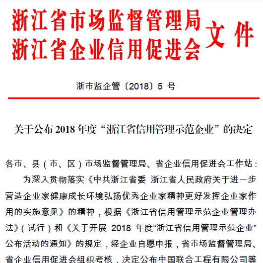 銀江環保榮獲2018年度“浙江省信用管理示范企業”
