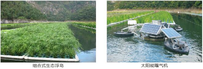 水源地保護(hù)、湖泊水體綜合治理采用組合生態(tài)浮島(專利)加太陽能曝氣(專利)技術(shù)。