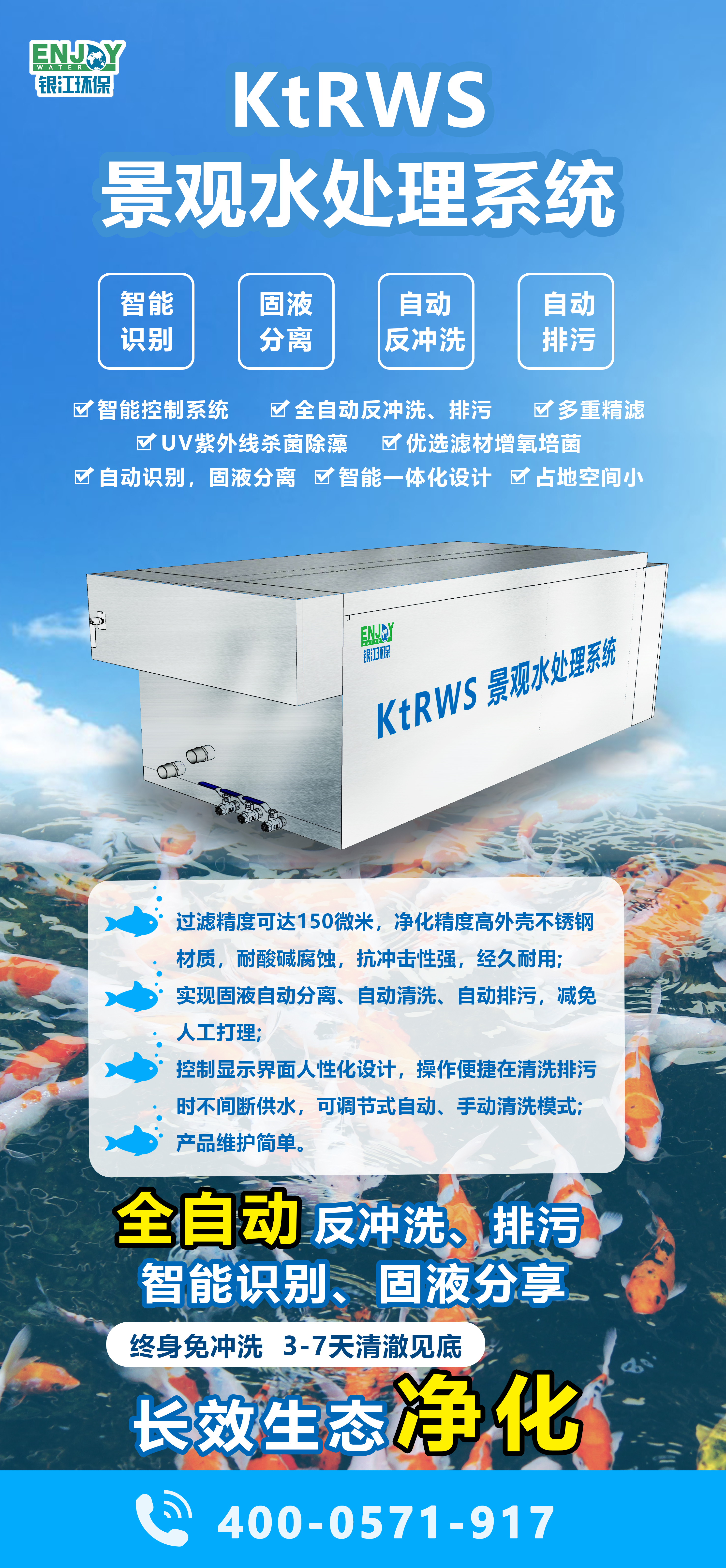 杭州銀江環保科技有限公司2014年7月承接杭州阿里巴巴淘寶城A2項目水處理工程,該項目位于阿里巴巴董事局辦公室附近,水面面積約1000平方,內有大量的珍貴錦鯉,我公司負責承接該錦鯉池水處理系統。項目主要采用多級精密過濾+生物膜法+殺菌滅藻的工藝。處理后水質清澈見底,滿足錦鯉養殖需求,同時提高魚池的觀賞效果。