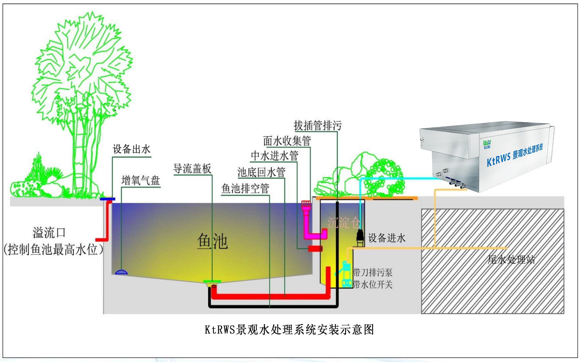 根據現場情況,可選擇采用景觀池岸邊地埋實施或采用地下機房設備實施。 無養魚要求的景觀水池,采用水處理設備結合種植沉水植物,構建水下森林。
