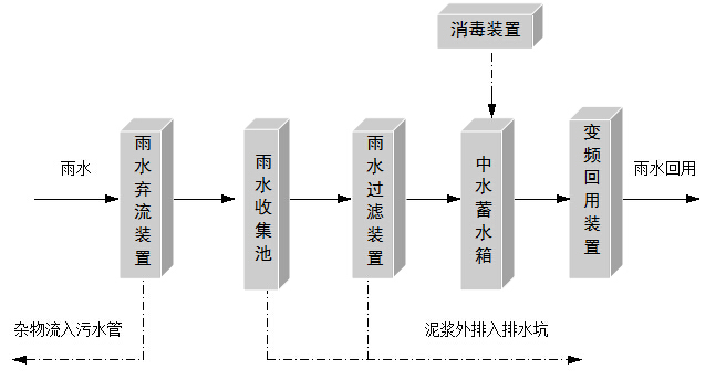 地下室的雨水收集水池容積為180m3左右,綜合考慮各項參數,雨水回用系統的設計處理流量為20m3/h。