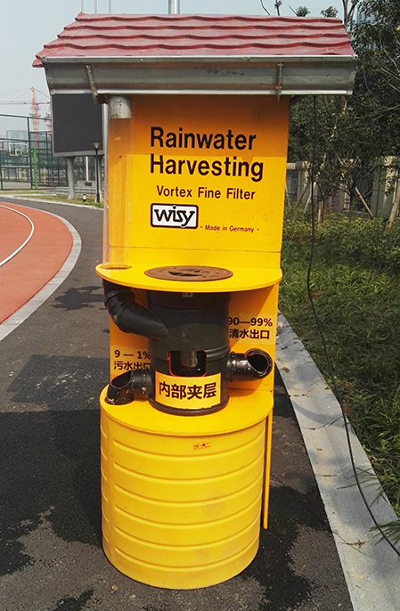 杭州勇進中學的雨水回收系統,WISY雨水回收過濾器。它打破了傳統的雨水回收概念,以一個全新的理念進行對雨水的收集和處理。WISY不僅適用于工業和公共建筑大樓,更可貴的是自身帶有的過濾功能和自動清洗功能,比傳統的方式省去了沉淀池和節省人力。且在收集過程中不用電和其他能源。產品采用離心過濾槽是歐洲廣泛用來收集雨水或地表水的一種管道裝置。雨水進入收集過濾器以后,因為圓弧形的內壁強迫雨水開始旋轉,有離心力發生,雨水貼邊,透過不銹鋼細網貼上內壁,落下到收集室,流到干凈雨水的出口。雜物,泥沙,樹葉等跟著少量雨水一起沖到排水口落下。回收率在小雨時候能達到90%以上。