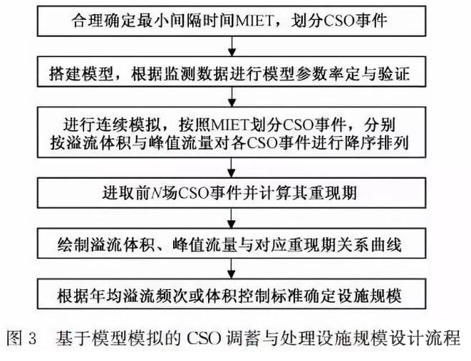 合流制排水管渠系統(tǒng)的溢流特征受降雨特征、匯水區(qū)域大小、用地情況、截流干管和污水處理廠運行工況等條件影響,較為復(fù)雜。實際運行中,CSO結(jié)束的時間會滯后于降雨,降雨強度峰值前后、峰值之間往往不發(fā)生CSO,導(dǎo)致經(jīng)常出現(xiàn)溢流的間斷時間長于降雨事件間隔時間的情況,此時,按照一場降雨最多產(chǎn)生一次CSO事件的原則,用于劃分CSO事件的MIET取值會大于用于劃分降雨事件的MIET,具體取值大小應(yīng)根據(jù)不同項目條件做具體分析,也可根據(jù)大量工程建設(shè)及運行經(jīng)驗統(tǒng)一確定適用于本地區(qū)CSO事件劃分的MIET,如美國華盛頓州的CSO事件的MIET取值為24 h(大于降雨事件的MIET=18 h)。從CSO控制系統(tǒng)的協(xié)調(diào)運行角度考慮,CSO事件的MIET確定還與CSO調(diào)蓄設(shè)施的排空時間、處理設(shè)施的處理能力等相關(guān)。綜上,基于模型模擬的CSO調(diào)蓄與處理設(shè)施規(guī)模設(shè)計流程如圖3所示。