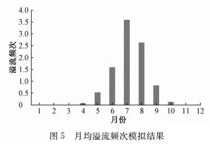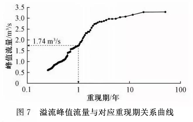 參照上述方法,可得到溢流峰值流量與對應(yīng)重現(xiàn)期關(guān)系曲線如圖7所示,1次/年、2次/年、3次/年、4次/年對應(yīng)的溢流峰值流量分別為1.74 m3/s、1.05 m3/s、0.83 m3/s、0.60 m3/s,可用于CSO調(diào)蓄池設(shè)計進水流量(可據(jù)此進一步確定進水管管徑)和CSO處理站/廠的設(shè)計最大處理流量的設(shè)計。