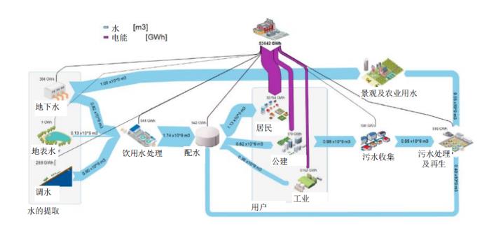 水與能互相關聯,互為條件,相互依存。世界的能源安全高度依賴于水資源的供應,因為幾乎所有的能源生產技術,如核能、熱電、水力發電,都需要消耗大量的水;水的社會循環過程,從自然環境(地表、地下)的提取、處理、分配及使用、污水處理及回用都需要消耗大量的能源,同時水的 “包容性”又使其蘊含了豐富的可以回收的資源和能源,因此“水”與“能”往往相伴相生。據統計,水系統能耗及GHG排放是城鎮總電能消耗量及GHG排放量的重要來源,根據美國EPA統計數據,水系統用電量占全社會用電的3%~4%;美國城鎮水務板塊GHG排放貢獻率占全社會GHG的5%,這個指標在英國則更高。現代城市水系統架構下的“水-能”關系賦予了未來城鎮水系統規劃嶄新的視角和維度,“雙碳”背景下統籌“水-能關系”來系統構建城鎮水系統尤其是排水系統規劃將更具現實意義。