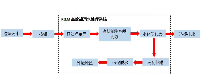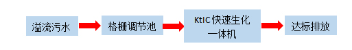 溢流生活污水經格柵調節池后進入KtIC快速生化一體機進行處理。設備內部設置缺氧區、兼氧區、好氧區、泥水分離、消毒,經處理后的污水達標排放。
