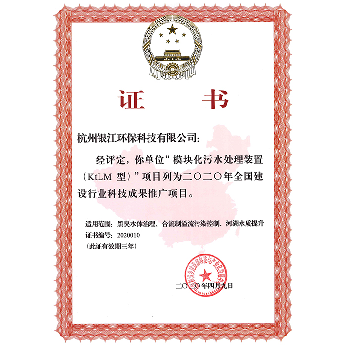 該技術(shù)在住房和城鄉(xiāng)建設(shè)部科技與產(chǎn)業(yè)化發(fā)展中心主持召開“模塊化污水處理裝置(KtLM型)”科技成果評估會上 評估委員會專家一致認為:該項目開發(fā)的與MBBR工藝相結(jié)合的浮選沉淀工藝具有創(chuàng)新性,達到國內(nèi)領(lǐng)先水平,同意通過評估,并列入2020年全國建設(shè)行業(yè)科技成果推廣項目。