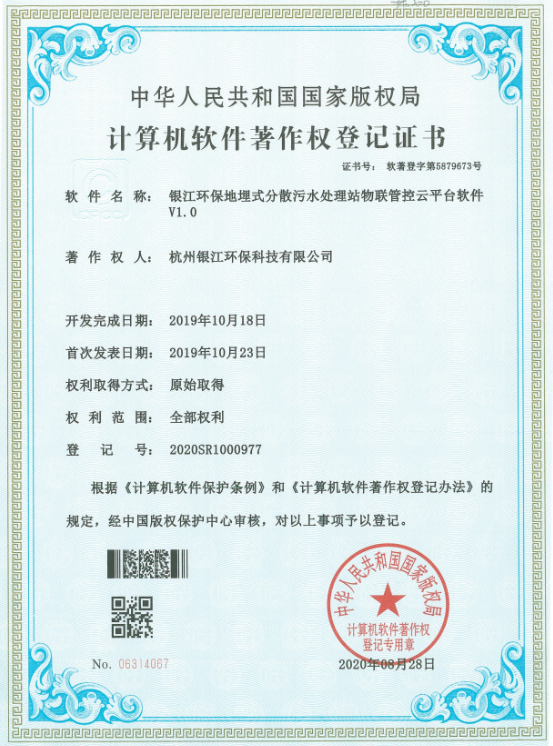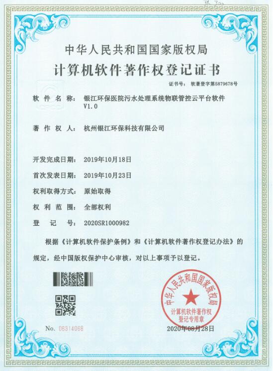 杭州銀江環(huán)保科技有限公司再獲兩項(xiàng)軟著:銀江環(huán)保地埋式分散污水處理站物聯(lián)管控云平臺(tái)軟件V1.0、銀江環(huán)保醫(yī)院污水處理系統(tǒng)物聯(lián)管控云平臺(tái)軟件V1.0,該軟著的取得為銀江治水又添一利器。